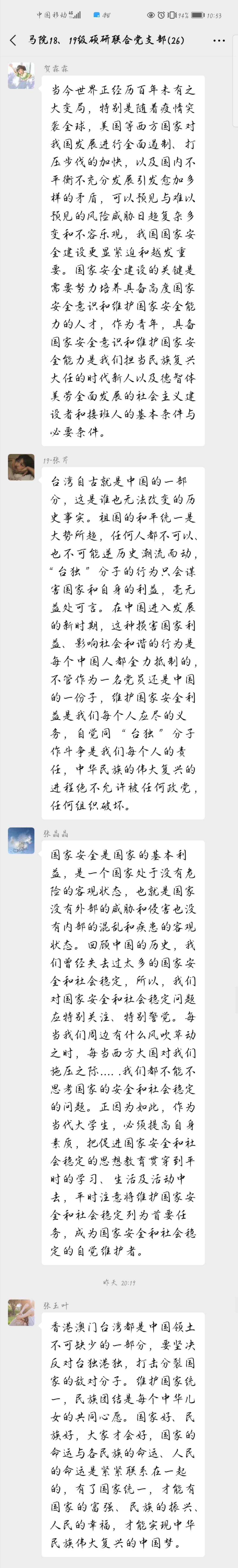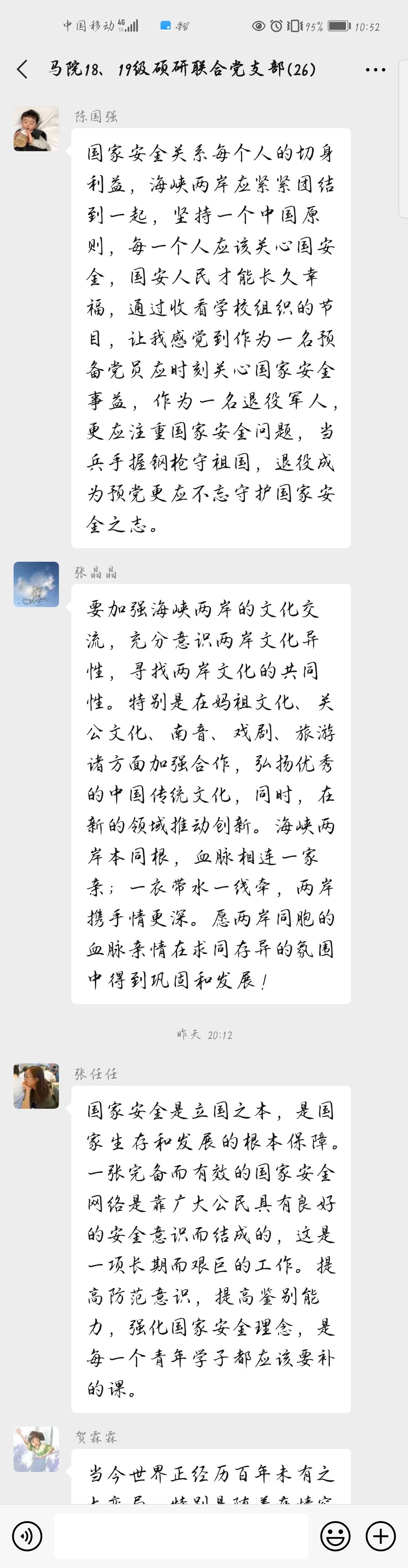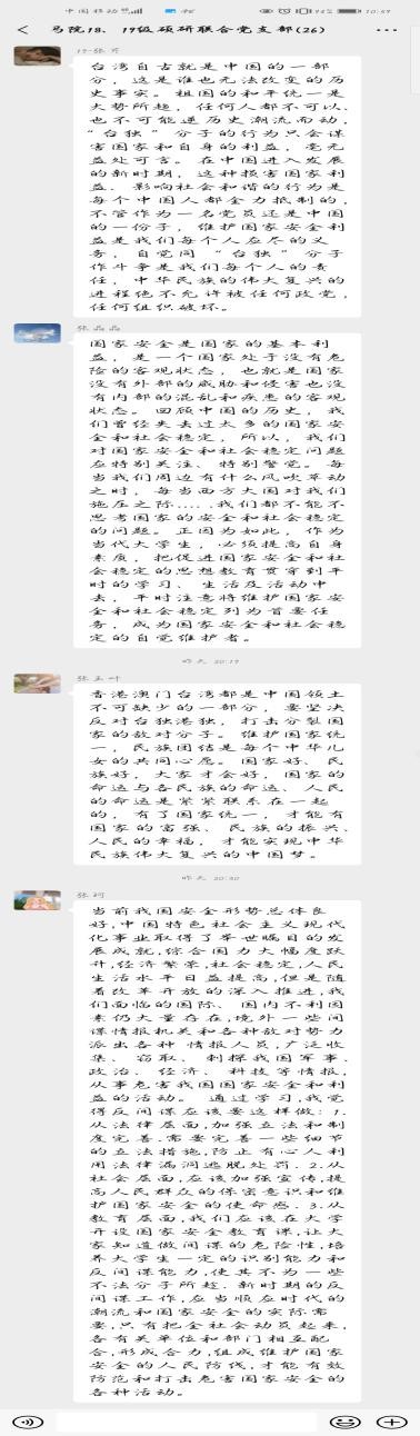 通过观看节目,支部党员了解到近期,国家安全机关专项行动破获数百起间谍窃密案件,抓获一批台湾间谍及运用人员,打掉台湾间谍情报机关针对祖国大陆布建的间谍情报网络。“百起间谍案”数量惊人,引起支部党员的反思与讨论。支部党员孙启鸣认为,“自古以来,台湾就是中国领土不可分割的一部分。1992年,台湾与大陆达成的九二共识,更是反映了海峡两岸人民渴望统一的美好愿景。而极少数的“台独”破坏分子,妄图分裂国家,通过构建间谍组织渗透大陆企图破坏国家统一和领土完整,其行为是完全违背国家安全法律与历史发展方向的,也是违背两岸人民意愿的”;支部党员刘佳琦认为,“这次国家对于台湾间谍组织的严打破获,不仅体现了中国在对国家安全和领土完整问题上‘零容忍’的态度,也展现了中国共产党强有力的执政力量,同时也顺应了两岸人民共同谋求国家统一的美好愿望,是完全正当与正义的行为,也是中国特色社会主义发展的要求”;党员茹佳梦表示,“国家安全事关重大,作为一名员工党员,我们要不断增强自己的安全知识与储备,时刻提高警惕,以实际行动践行习近平总书记提出的总体国家安全观。”