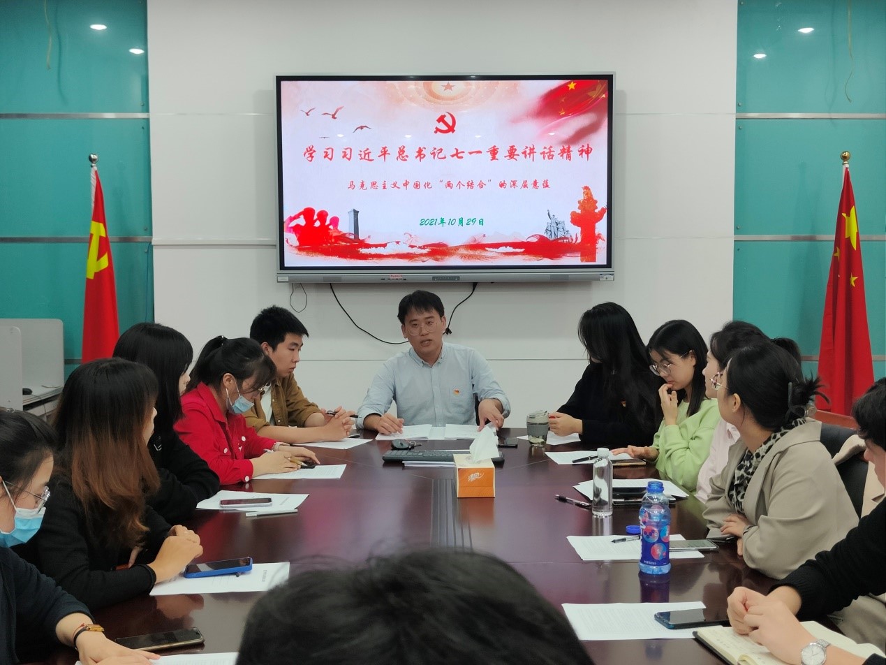 根据党支部组织生活安排的有关要求,10月29日晚19时,2019级硕研党支部在学院B113会议室召开本月的专题组织生活会进行政治理论学习。本次组织生活会的主要议题是学习领会习近平总书记于7月1日在庆祝中国共产党成立100周年大会上的讲话的重要精神,着重领会习近平总书记关于“两个结合”的重要思想,即“把马克思主义基本原理同中国具体实际相结合、同中华优秀传统文化相结合”的重大理论观点。党支部书记林豪庭同志带领大家进行了学习。