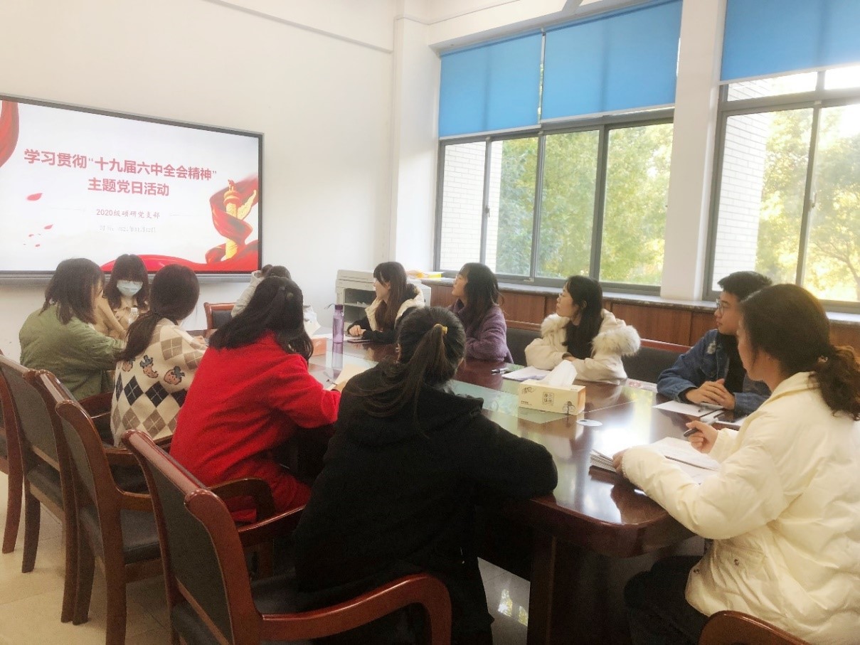为深入学习贯彻十九届六中全会精神,进一步增强党员同志政治判断力、政治领悟力、政治执行力,更深层次地理解和坚持中国特色社会主义,2020级硕研党支部成员于2021年11月12日上午10点自行收看了十九届六中全会发布会,并于下午两点半在学院B210会议室组织召开了学习贯彻“十九届六中全会精神”专题学习会,会议由支部书记陈静同志主持。