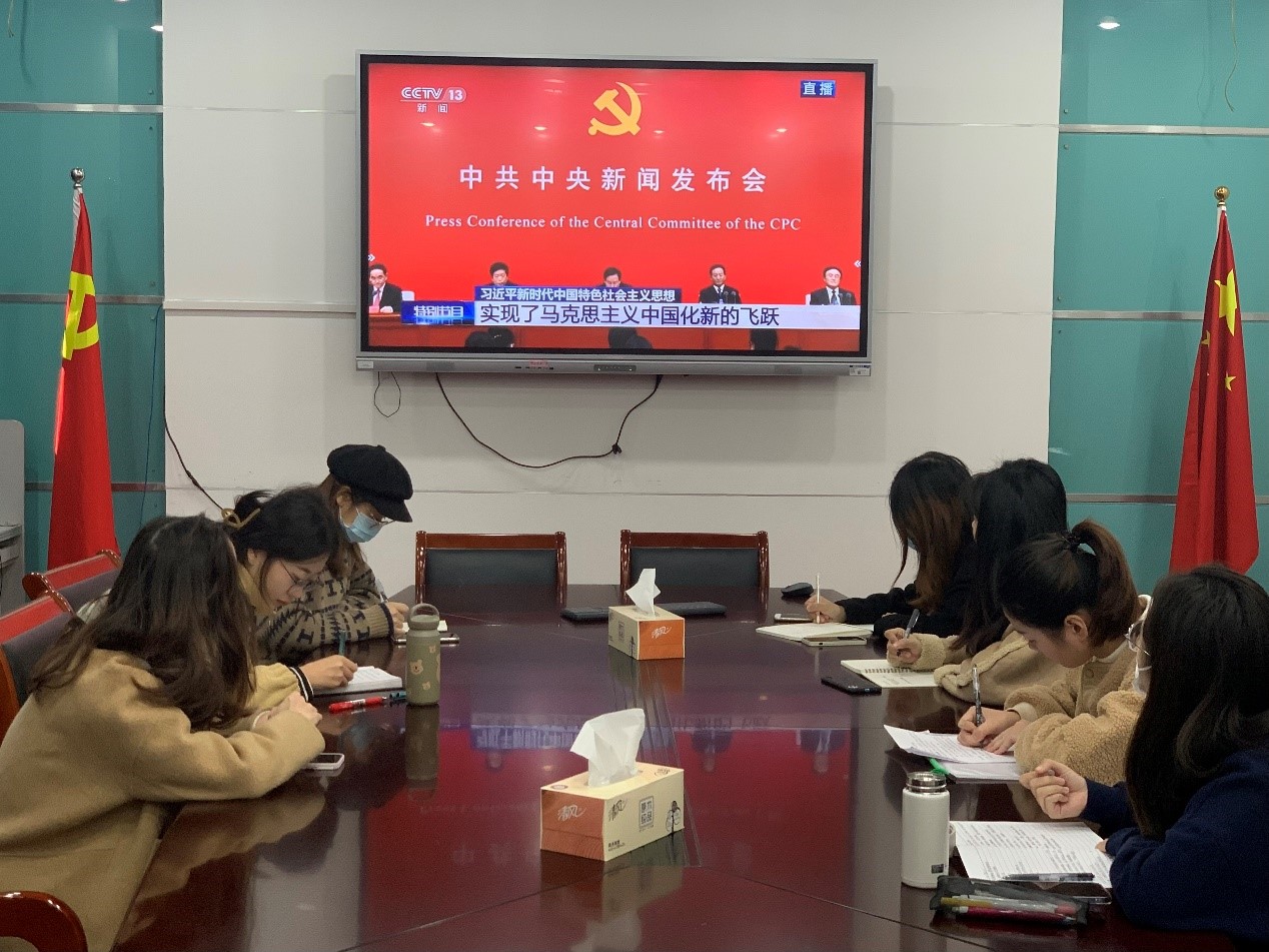 11月12日上午,2021级硕研党支部在学院B113会议室召开了学习十九届六中全会精神的学习会。首先党支部书记周舟从十九届六中全会的地位和内容出发,向大家介绍了本次全会的议程和重要意义。上午10时,支部全体党员观看了关于中共中央就党的十九届六中全会精神举行的新闻发布会。党员同学们从答记者问中更好地学习了十九届六中全会公报的内容及党的百年奋斗重大成就和历史经验的重要意义。