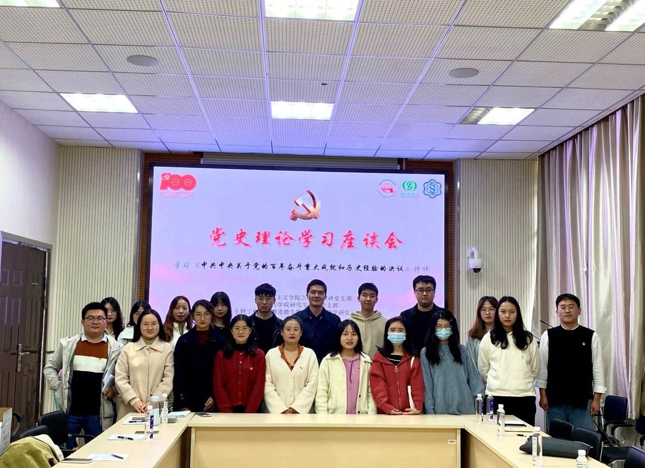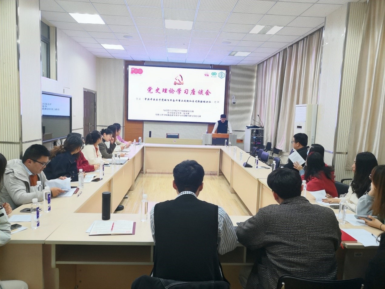 为不断推进党史理论学习,深化支部党员对中国共产党第十九届六中全会精神,以及对全会通过的《中共中央关于党的百年奋斗重大成就和历史经验的决议》的深入理解,11月19日下午14时,2019级硕研党支部与药学院研究生第二党支部、生物工程学院酿造微生物学与应用酶学研究室党支部在公司B117会议室联合组织召开党史理论学习座谈会。本次会议由林豪庭同志主持,副经理侯勇教授参加了此次会议。