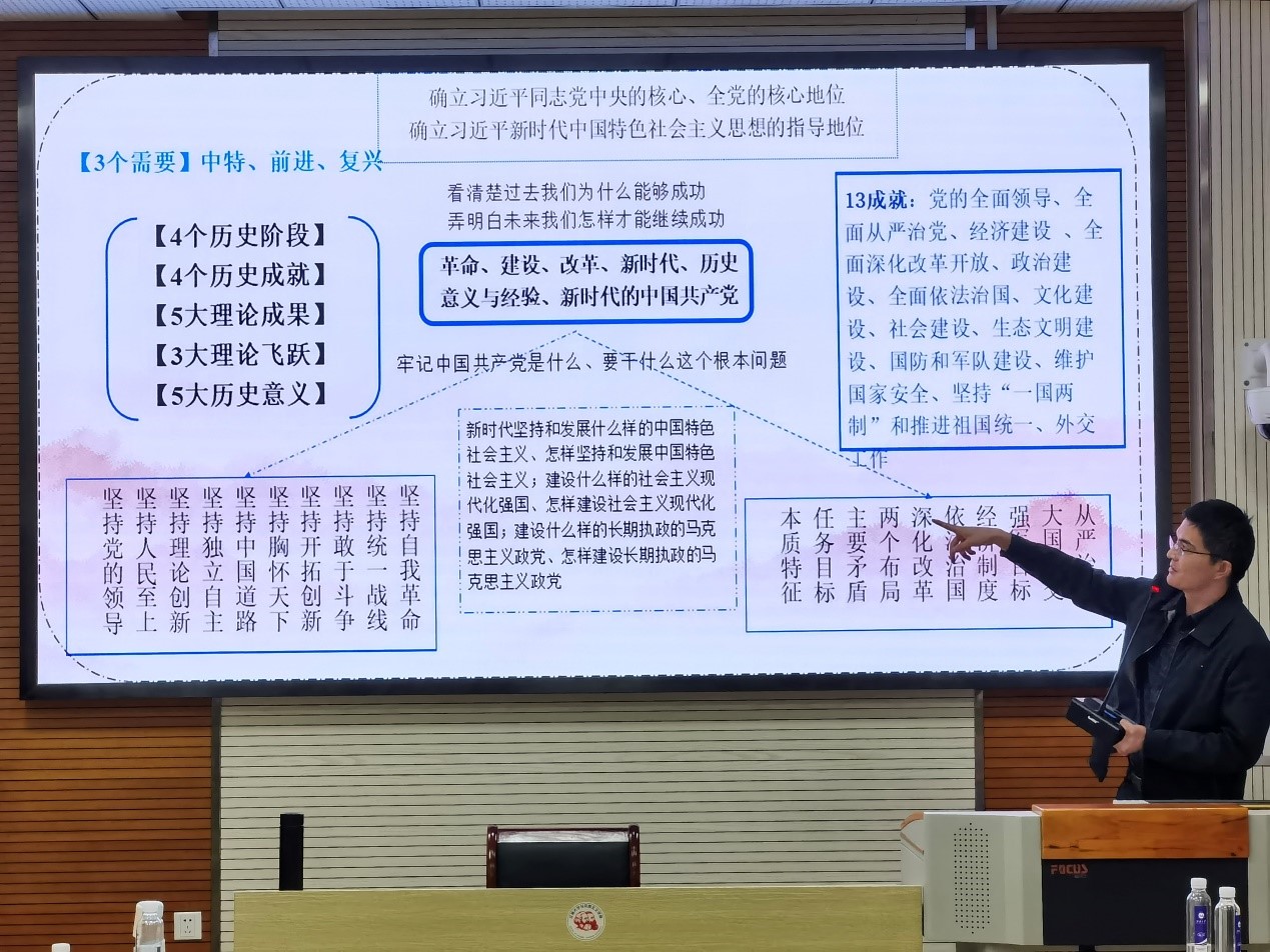 会议第一项,由林豪庭同志从“夺取新民主主义革命伟大胜利”、“完成社会主义革命和推进社会主义建设”、“进行改革开放和社会主义现代化建设”、“开创中国特色社会主义新时代”、“中国共产党百年奋斗的历史意义”、“中国共产党百年奋斗的历史经验”和“新时代的中国共产党”七个方面对《决议》内容进行领学。他指出此次的《决议》是我们党历史上的第三个《决议》,是在中国共产党建党100周年这一重要历史节点上提出的,《决议》系统地总结了我们党的百年奋斗的历史经验,为我们在党的领导下实现第二个百年奋斗目标指明了前进方向。