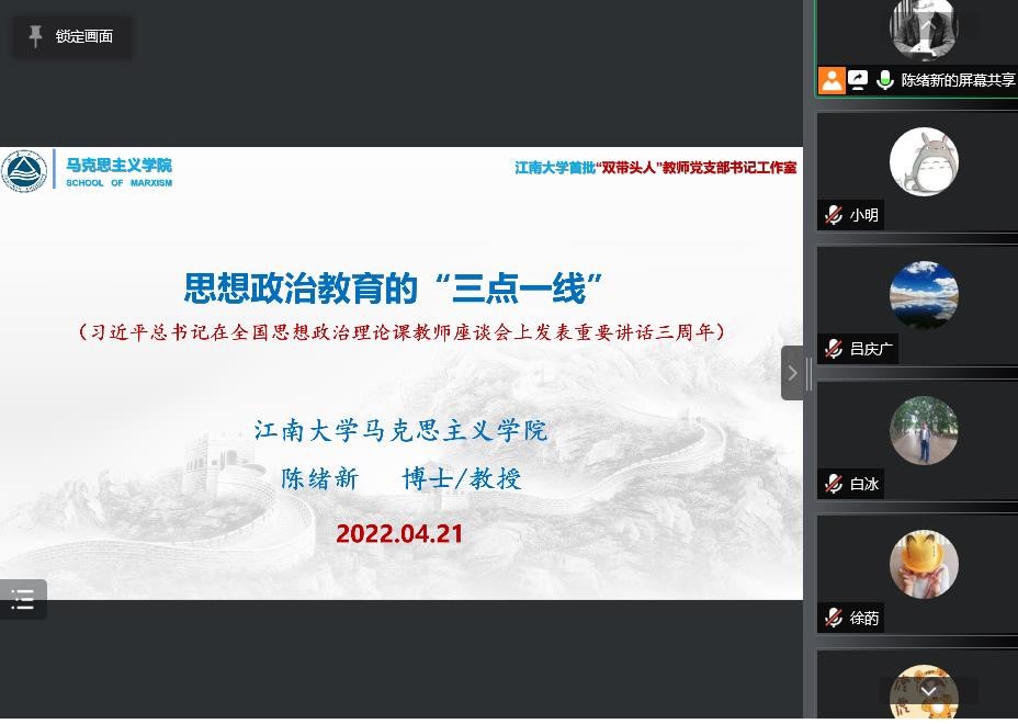 4月21日上午,英国上市公司365首批“双带头人”教师党支部书记工作室——英国上市公司365教工第二党支部开展线上理论学习,重温习近平总书记在学校思想政治理论课教师座谈会上的重要讲话,学习“廉洁从政、廉洁从教、廉洁从学”专题内容。会议由支部书记陈绪新教授主持,支部全体党员参加了此次理论学习。