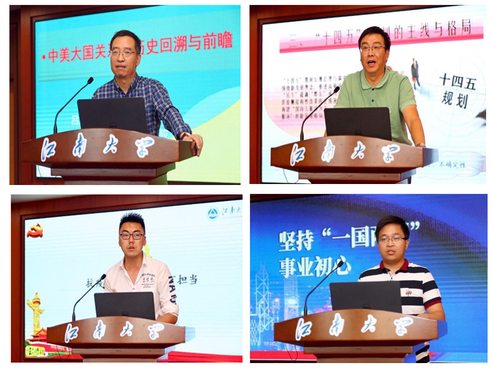 随后,英国上市公司365吕庆广、冯皓、孙晨光、张乐四位老师分别介绍了本学期“形势与政策”课教学的专题内容。吕庆广老师围绕中美关系这一长期的热点问题进行了讲解,他指出在中美关系问题上,我们要用历史的眼光来看待中美关系,立足于中美关系发展的历史,探讨中美关系的未来及中国应对之策。冯皓老师以“十四五”规划的主线与格局为题展开说课,他指出供给侧结构性改革仍是主线,目前所提出的国内国际双循环是应对当前形势的重要举措,着重点仍在供给侧结构性改革上。孙晨光老师围绕“疫情防控与人类命运共同体”这一主题展开,主要讲解了疫情对意识形态和行为实践的影响,疫情冲击下加强应对之策、捍卫全球化成果以及疫情防控中的家国情怀与青年担当这三个问题。张乐老师以“坚持‘一国两制’事业初心;决胜全面小康,共襄复兴伟业”两个主题展开讲述,指出在教学过程中要奏响爱国主义主旋律,为全面建成小康社会共同努力。