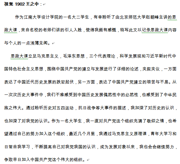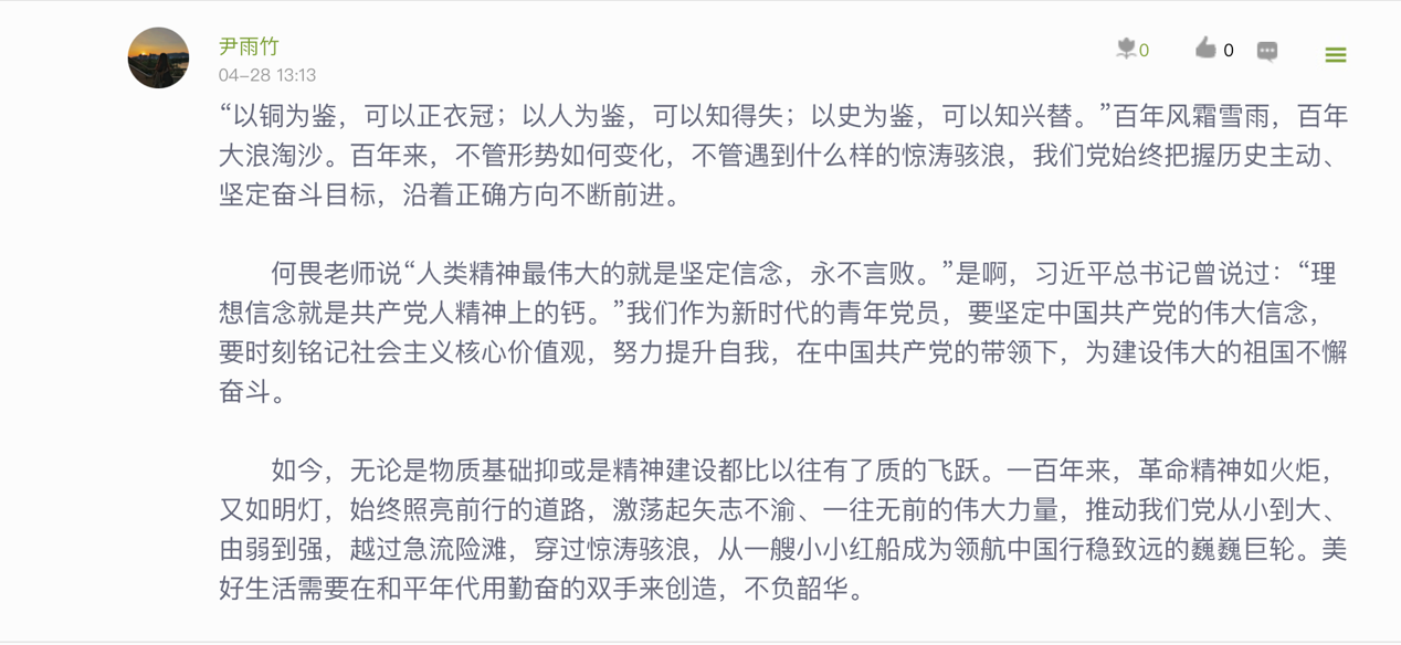 环工1902本科生刘聪颖说:“喜欢这么一句话。一部党史,就是一部不断战胜困难、创造奇迹的历史。虽然逆风开局,但依旧依靠他顽强拼搏强行逆转局势,缔造神话。这100年来,中国人民在中国共产党的领导下不断探索救国之路成成败败,经历了许多坎坷,走过了许多弯路,但是我们的前辈们从来没有放弃过,就算只有一丝希望,也要用尽全身的力量把它握紧,直到胜利的光芒洒落到全国的每一个角落。这一切无不证明了一句话:没有共产党,就没有新中国。”