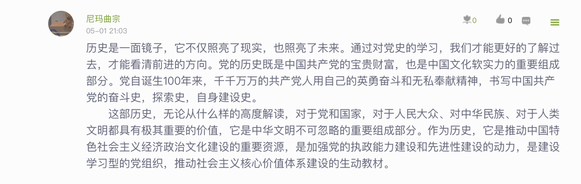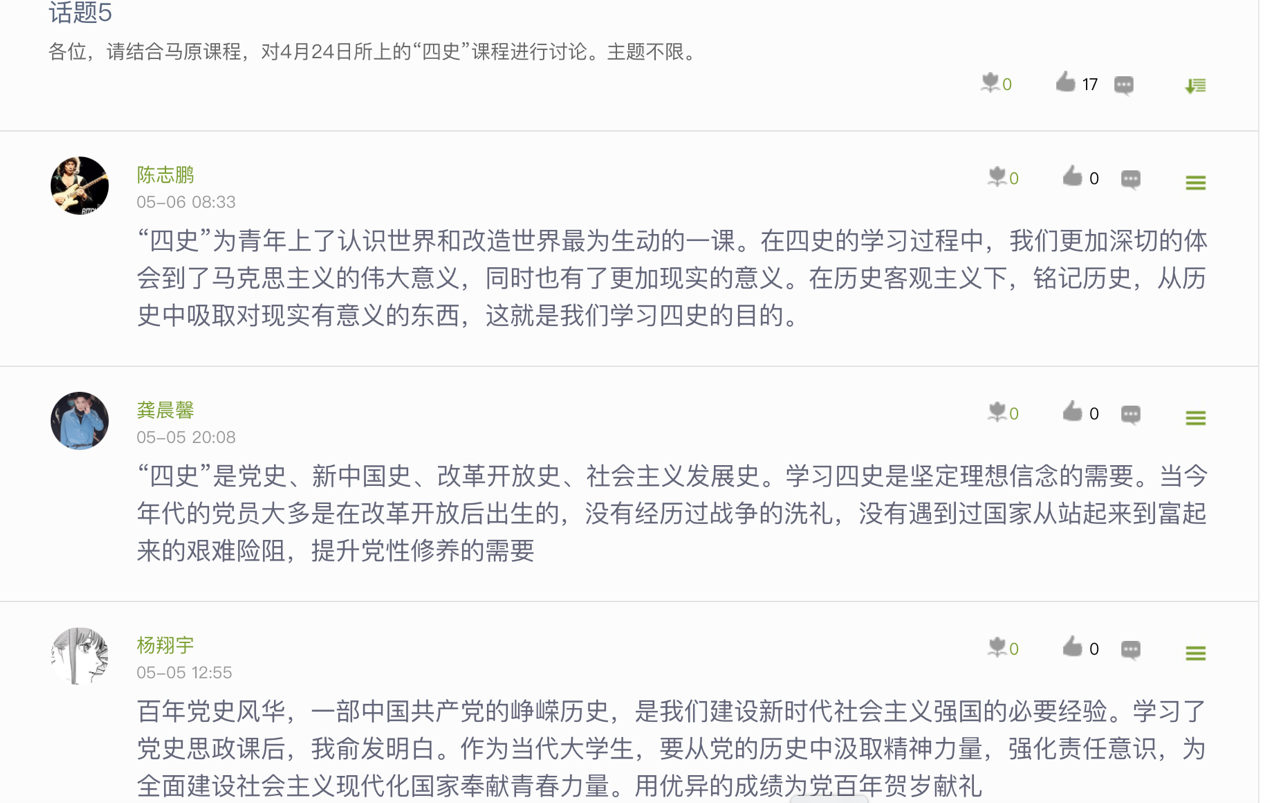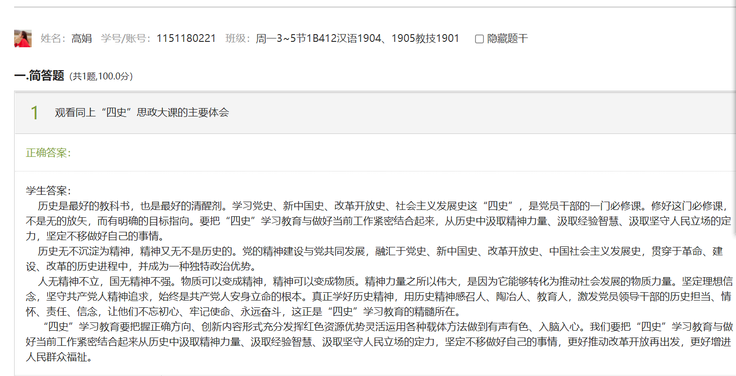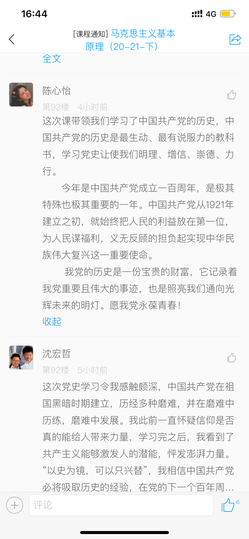自动化1901本科生付玮琦说:“今天观看的‘同上四史思政大课’,让我深刻意识到了学习党史的重要性,收获颇多。历史是教科书,我们如今美好的生活,都是当年一群群有志青年,为了心中的理想信念牺牲换来的。在党的各个历史时期,在那样艰苦的时代背景下,前辈们挺身而出,披荆斩棘。历史无不沉淀为精神,精神无不是历史的,我们所学习的抗美援朝精神,大庆精神,铁人精神,“两弹一星”精神……在当下依然能够激励我们前进的,是先辈们用汗水和鲜血浇筑的中国力量。一代青年,有一代青年的历史际遇。我们要学党史以勇担责。今天,我们回顾了共产党的光辉与艰难,从历史中吸取养分。明天,我们将继续坚持中国共产党的领导,以长风破浪会有时的豪气,为共同实现中华民族伟大复兴而努力奋斗!”