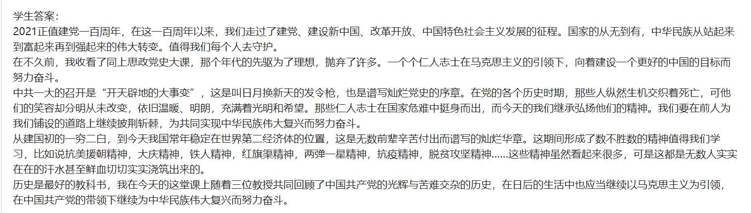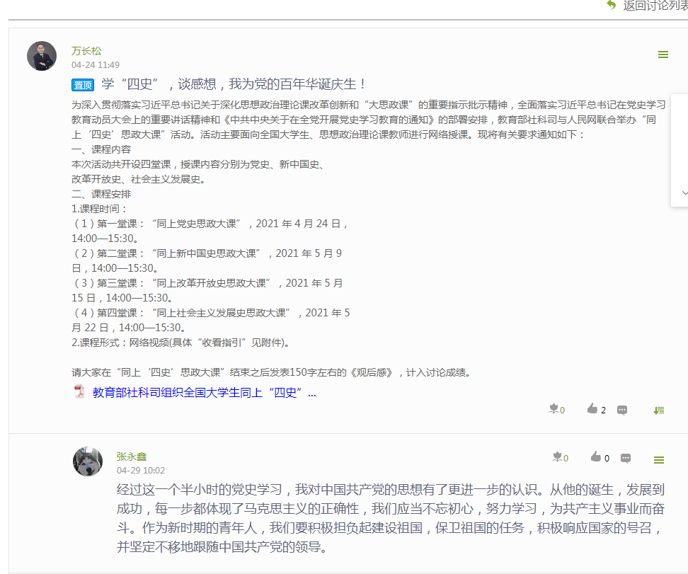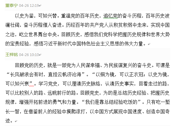 课程结束后,在随后课堂教学期间,员工们结合 “同上‘党史’思政大课”活动,畅谈对“当代老员工党史学习”的感悟体会。同学们热情高涨,纷纷表达了自己的感想,大家一致认为:此次课程思想深刻,内容丰富,举例生动,精彩讲述了中国共产党的百年党史,具体讲解了中国共产党与中华民族的伟大复兴的根本联系,使大家充分了解了中国共产党革命精神形成与传承的光荣历程,重点阐释了中国共产党开天辟地、敢为人先的首创精神,坚定理想、百折不挠的奋斗精神,以及立党为公、忠诚为民的奉献精神,是一场生动而震撼的精神盛宴。