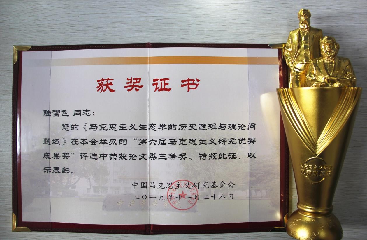 近日,由中央党校(国家行政学院)习近平新时代中国特色社会主义思想研究中心、中央党校(国家行政学院)英国上市公司365、中央党校(国家行政学院)培训部与中国马克思主义研究基金会共同举办的“第十一届中国特色社会主义论坛暨中国马克思主义论坛2019”在中央党校(国家行政学院)隆重召开。会上举行了第六届马克思主义研究优秀成果奖颁奖仪式。公司陆雪飞副教授发表于《世界哲学》2018年第6期的《马克思主义生态学的历史逻辑与理论问题域》一文获得论文类成果三等奖。