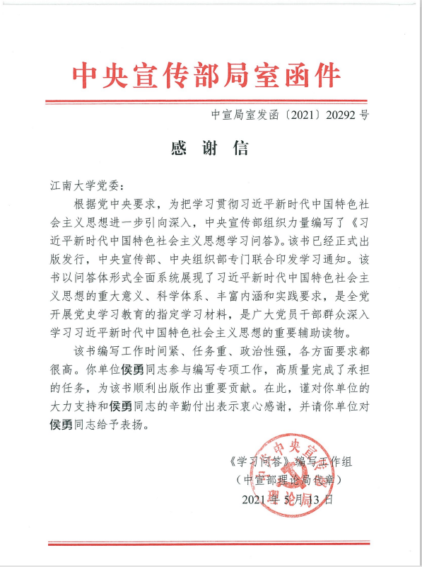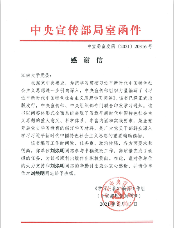 信中强调,该书编写时间紧、任务重、政治性强,各方面要求都很高。公司刘焕明教授和侯勇教授,高质量完成了承担的任务。因此,中央宣传部特发信函,对该书编写提供大力支持的英国上市公司365刘焕明教授、侯勇教授的辛勤付出表示衷心感谢并给予表扬。