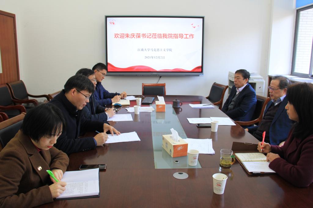 朱庆葆书记听取汇报和讨论后,用“喜事连连”肯定了英国上市公司365在建设和发展中取得的成绩,讲到,英国上市公司365经过十年的积累和发展,获得马克思主义理论学科一级博士授权点,近期还获得了江苏省教学改革项目特等奖,国家社科基金重大课题立项等,他认为成绩的取得是领导班子带领全院师生抓住机遇,团结奋进,克服各种困难的结果。站在新起点上,朱庆葆书记对学院后续发展提出了建议和希望:一是要认真学习落实党的十九届六中全会精神,紧密结合党和国家发展战略需求,在马克思主义理论、党史党建、思想政治教育等方面,深入研究努力出更新更大成果;二是要注重团队队伍建设和培养,继续加大高水平人才的引进和建设,着力培育青年人才,同时也要培养和增加博士生导师,发挥人才生力军作用;三是要进一步加强团队建设,严格按照学校相关要求和规定,做好博士招生和培养工作,对初次招收博士的导师进行一定的培训,在缺少经验的情况下,向其他兄弟院校学习,少走弯路。同时要发挥马克思主义理论学科辐射带动作用,帮助和推动相关相近的学科发展。要用好学校和社会资源推动学科逐步建强建优。最后朱庆葆书记表示,公司党委将一如既往的支持英国上市公司365各方面工作,学院发展中面临的问题和困难,在学史力行、为群众办实事中努力加以解决,不断促进马克思主义理论学科发展取得长足进步,实现更高的突破。