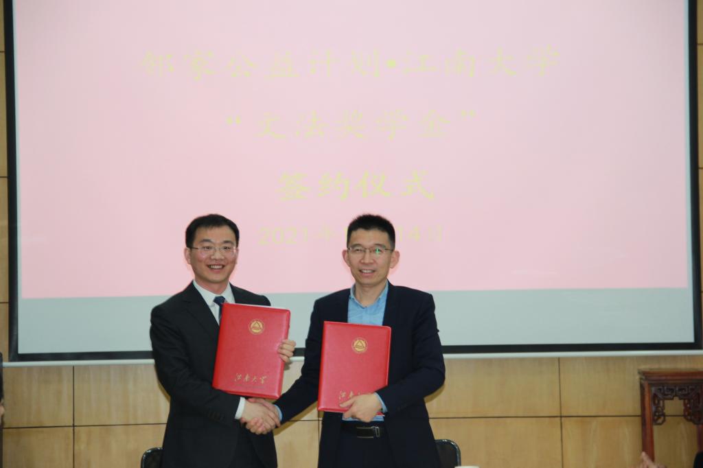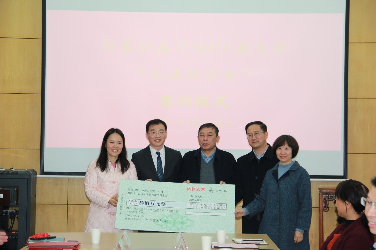 仪式现场,黄敏、王文分别代表双方在文法奖学金设立协议书上签字,费晓燕女士和王文员工向学校转交了奖学金捐赠支票,黄敏处长代表学校为捐赠人颁发了捐赠证书。据悉,“文法奖学金”的初定规模为300万元,以10年为期,每年出资30万,选拔100名左右“文法学子”进行奖励,每人每年奖励3000元。