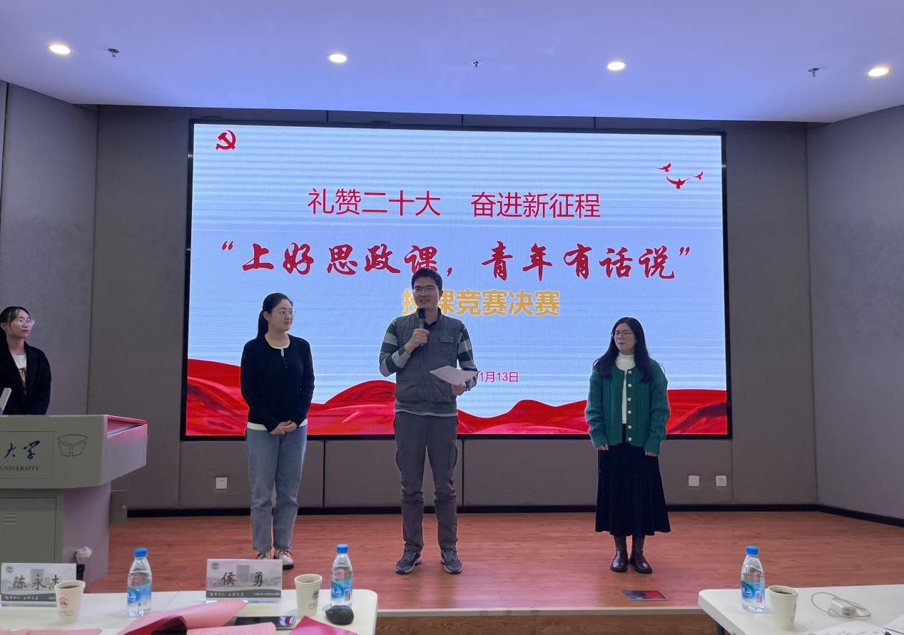 通过预选赛,陈虹妍等10名同学进入决赛环节。比赛中,10位选手以理想信念、文化自信、爱国主义思想、时代精神等为主题,充分结合党的二十大精神,绘声绘色地展示了内容丰富的思政课。侯勇、陈永杰、陈志宏、孙晨光、朱明明5位评委老师分别对选手的讲课进行了点评,既指出了优点与不足,也给予了表扬和期望。陈虹妍凭借其优秀表现荣获一等奖,孙玥、汤弘获二等奖,高雪瑜、洪玟雯、刘爱星获三等奖,其余选手获优秀奖,评委为获奖同学颁发了证书。