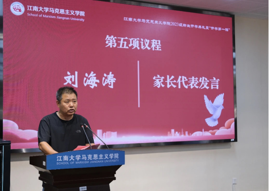 新生家长刘海涛代表家长发言,他对学院和老师的辛勤付出表达感谢,对刚入学的孩子们殷殷嘱托,期待他们在学院专心学习、快乐生活、全面发展。