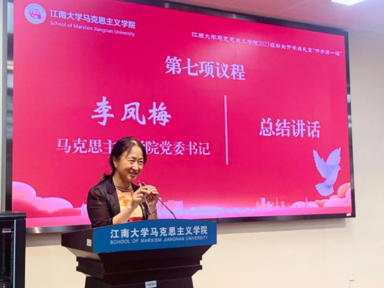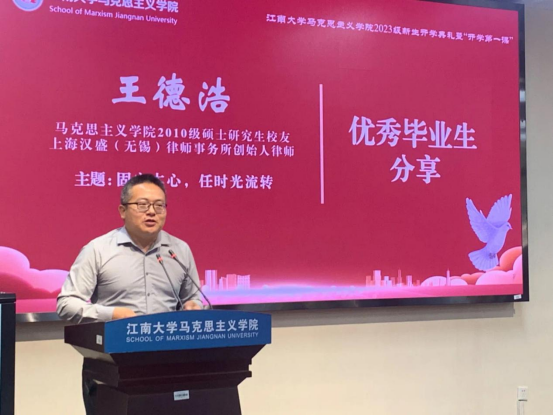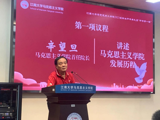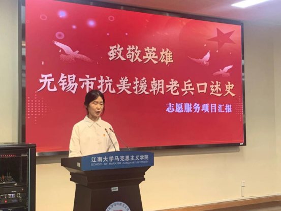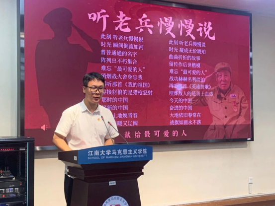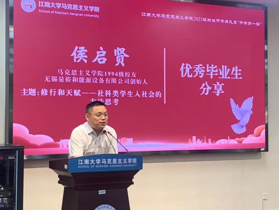 社会实践优秀团队成员分享实践心得和学习感悟。“马先声”支教团成员衣仲言、李婉瑜分享了暑期远赴贵州从江支教的经历,号召同学们积极投身志愿工作,用专业所学服务社会。2023年江苏省挑战杯特等奖获奖团队:“致敬英雄——无锡市抗美援朝老兵口述史”志愿服务组成员孙怡珂、阮佳伟用讲述、诗歌和视频等形式将采访老兵,抢救历史,赓续传承伟大抗美援朝精神的经历分享给全体新生,号召同学们勇担历史使命,不负青春韶华。