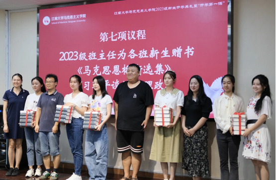 接着,学院领导向2022级、2023级班主任及副班主任颁发聘书,举行赠书仪式,由新生班主任为所带班级赠送《马克思恩格斯选集》、《习近平谈治国理政》,勉励同学们熟读经典原著,夯实理论基础,学有所思,学有所成。