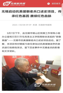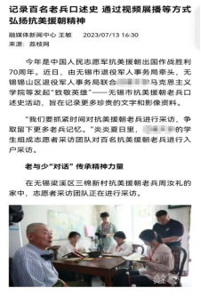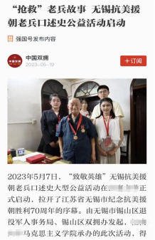 历史的车轮滚滚向前,英雄的事迹熠熠生辉。值抗美援朝胜利70周年之际,本项目以新时代如何赓续传承伟大抗美援朝精神为问题导向,综合使用了问卷调查法、口述访谈法等研究方法,对无锡地区100余位参战老兵进行一对一的“抢救性”口述史采访,形成调研报告、影像视频、老兵事迹展览等系列成果,探讨了新时代如何更好地传承弘扬伟大抗美援朝精神等问题,让青年员工和社会大众铭记历史,坚定历史自信,为全面建设社会主义现代化国家贡献力量。抢救历史,我们用心用情与老兵交流,一笔一画记录伟大历史;传承血脉,我们置身其中感悟老兵精神信仰,照亮自身未来前进航路。