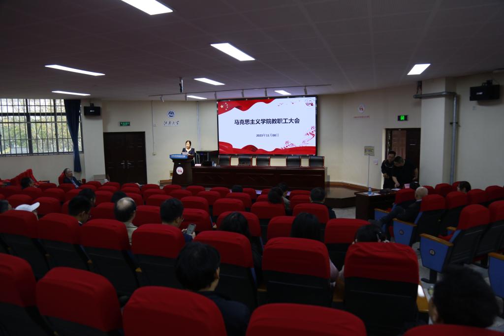 侯勇介绍了近期的学院重点工作:新一轮的博士点申报工作,学科点建设工作、本科教学审核评估、人才培养工作等。潘加军围绕分管领域向全院教职工汇报了上一阶段的工作开展情况以及下一阶段的工作任务。李凤梅再次强调本科教学审核评估的重要性,就本科教学审核评估学校基础、教学、质保方面的内容进行集中学习,并要求会后进一步自学。