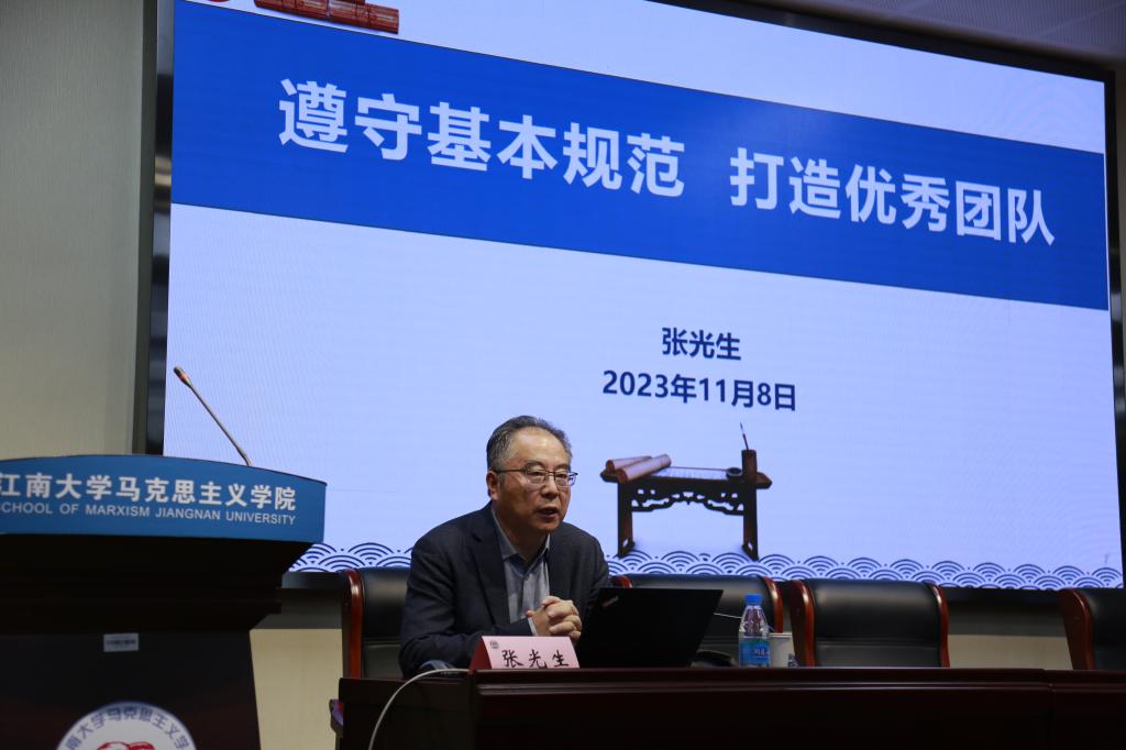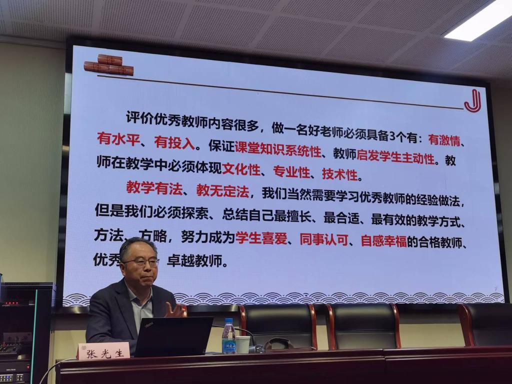 张光生教授首先为大家作了《遵守基本规范打造优秀团队》专题报告。张教授指出教师的首要任务是搞好教学,作为一名教师要始终思考教师教什么?员工学什么?怎么教?张教授同时强调评价一门课是不是好?并不是教师讲的是否精彩,而是引发员工思考、引导员工学习。根据形势不断变化、要求不断提高,教学需不断改革、管理需不断创新。随后,张教授结合自身丰富的经验,围绕接待、会务工作等基本规范、日常工作礼仪和打造优秀团队等进行了讲解和阐释,强调事业发展需要执作,团队建设需要运作、科学研究需要合作,老师们需要用文科的思维思考问题、用理科的思维研究问题、用医科的思维剖析问题、用工科的思维解决问题。希望老师们在思考中探寻方向,在实践中磨练本领,在学习中升华提高。做一个善思、实干、博学的人!做一个作风优良、有贡献的人!