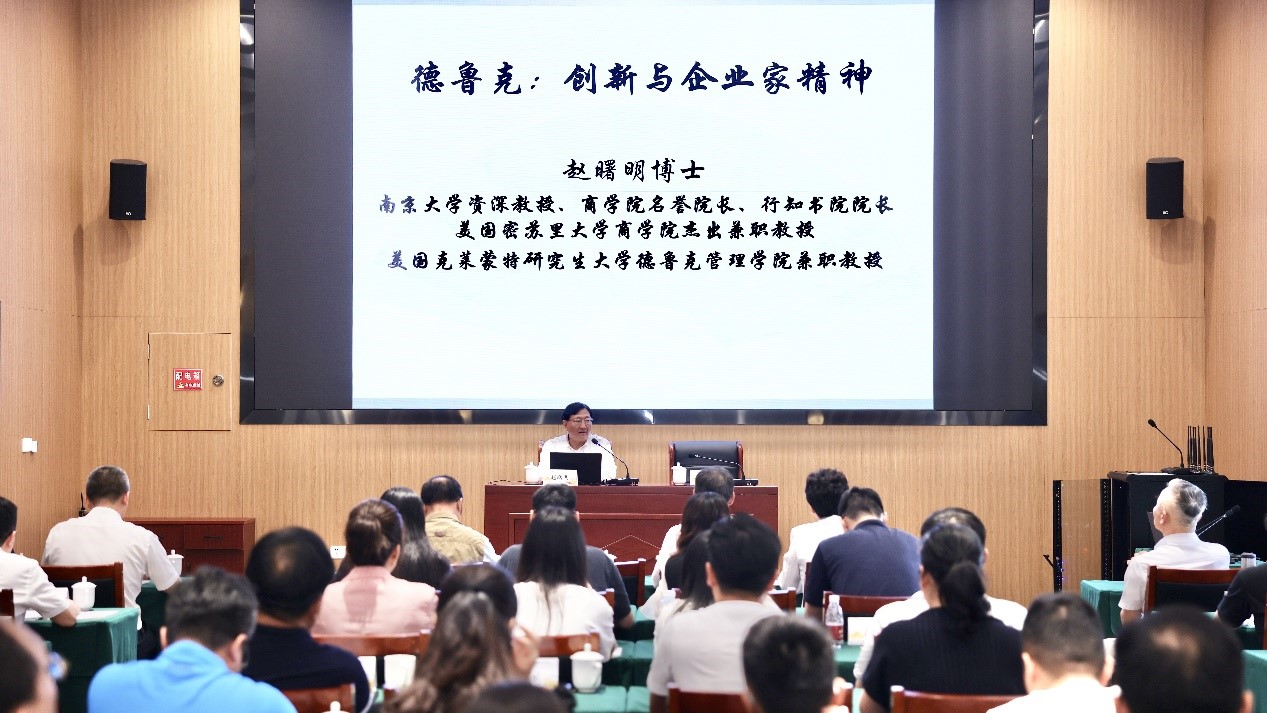 主题报告环节中,赵曙明教授以“德鲁克:创新与企业家精神”为题,由著名管理学家彼得·德鲁克的《创新与企业家精神》引入,阐述了企业创新制胜的机理、企业家精神的内涵以及管理人才的原则,并以国内外相关企业案例进行了深入分析。他提出中国企业家要有“创造绩效”“做好事”“不作恶” 的信仰,并应该具备掌握“知识”、具有“见识”、具备“胆识”与寻求“共识”的“四识”能力。
